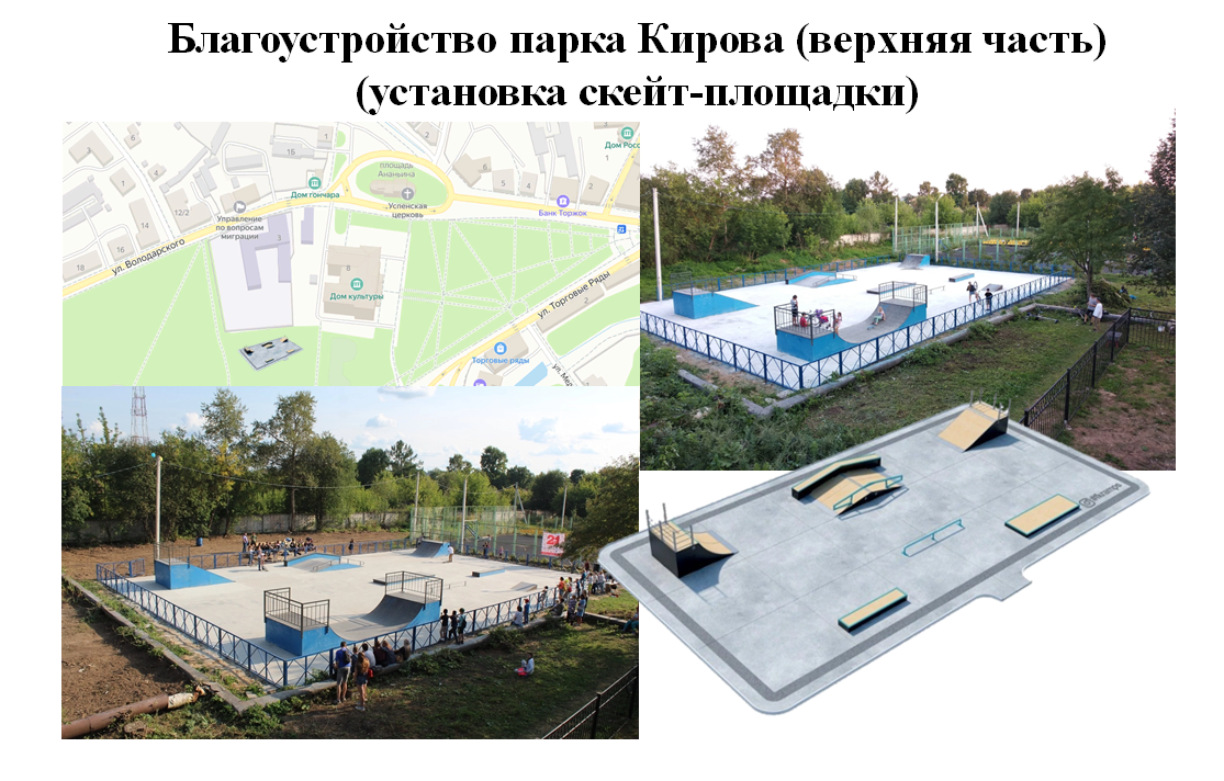 - Благоустройство парка Кирова (верхняя часть) (установка спортплощадки около ГДК, установка скейт-площадки);